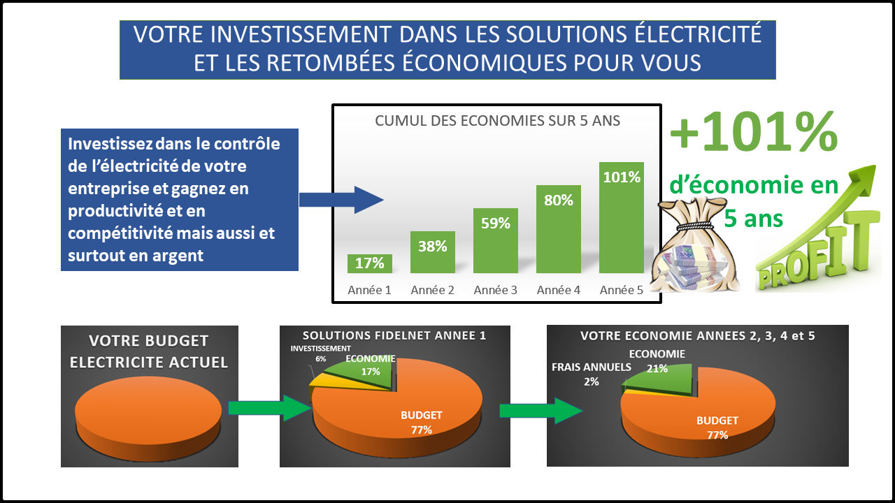 L’utilisation rationnelle et optimale de votre énergie électrique peut baisser de plus de 20% vos factures d’électricité. Nous vous apportons des informations capitales sur l’utilisation de l’énergie électrique à chaque instant dans votre Entreprise. De légères modifications vous apporteront des résultats insoupçonnés